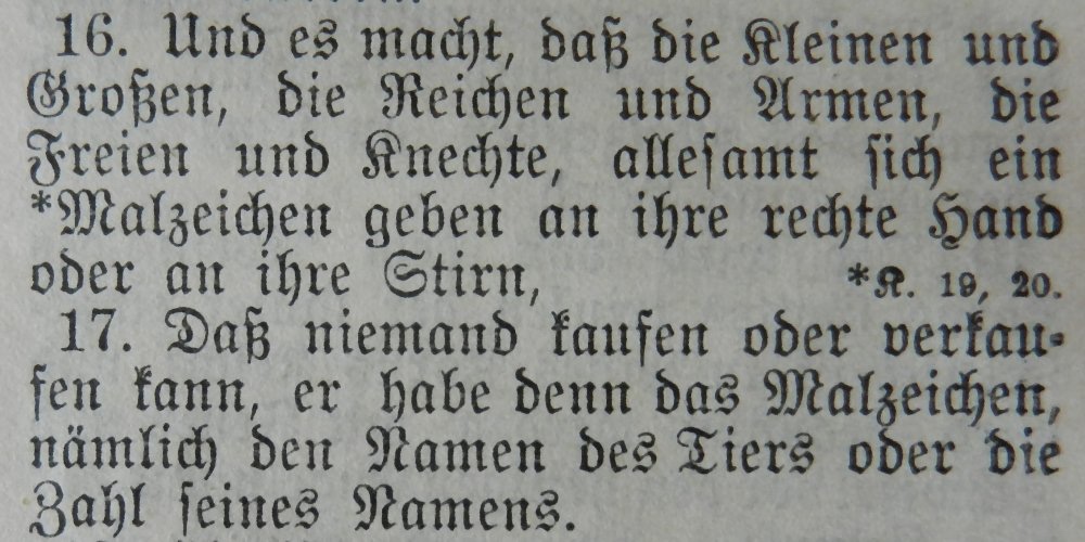 Das Malzeichen ist also die Zahl des ersten Tieres, des römischen Imperators. Dieses Tier wird die völlige Kontrolle über das Wirtschaftsleben erlangen. Die Menschen werden das Tier und sein Bild anbeten und sich auch fügen, wenn es um das Malzeichen an ihrem Körper geht (Off 14,9.11; 16,2; 20,4).